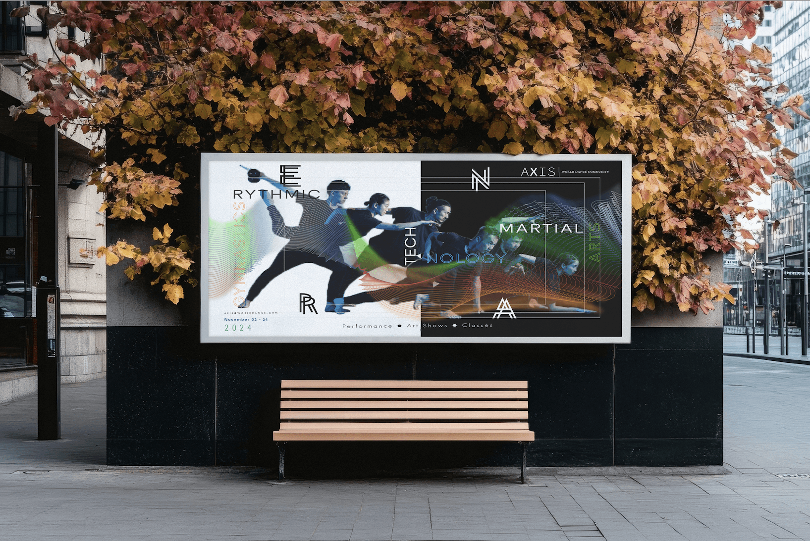 Create a poster for Axis, showcasing the Enra Troupe's bold, inclusive, and captivating performances that blend dance, martial arts, gymnastics and technology. Typography, colour and imagery should work seamlessly to bring life to the energy and movement of the troupe.